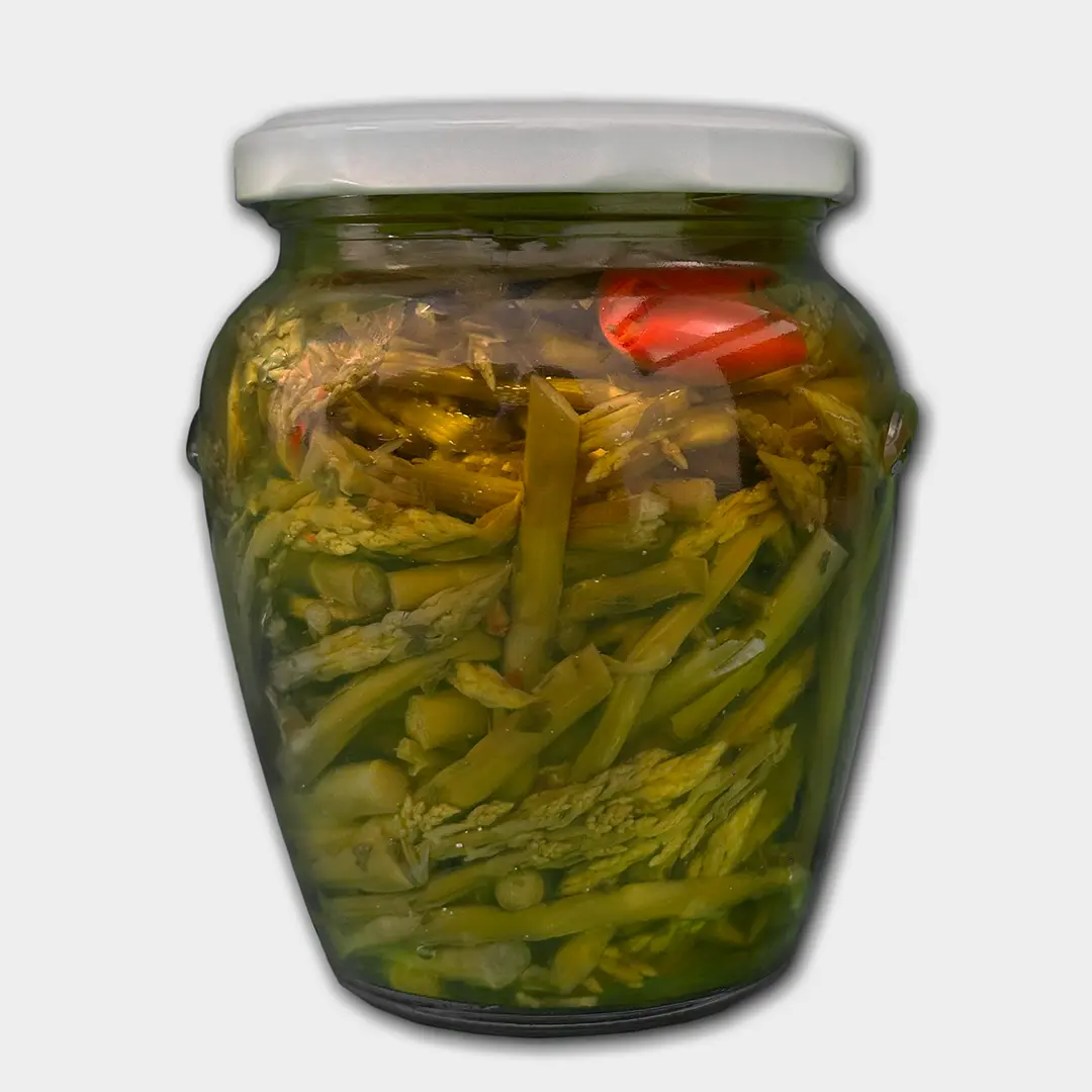 - Ingredienti: Asparagi, olio di semi di girasole, aceto di vino, prezzemolo, origano, peperoncino, aglio, sale, antiossidante E300, E330.