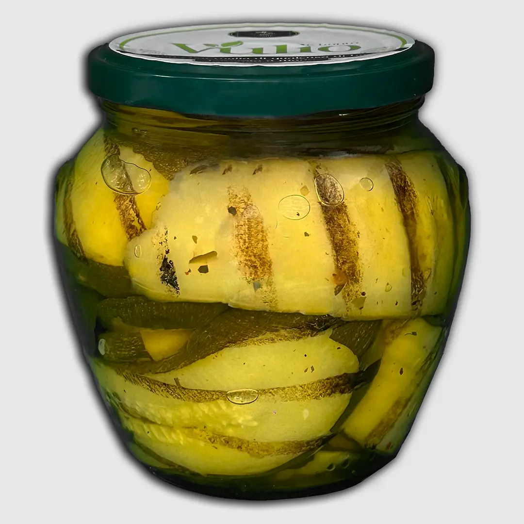 Le zucchine vengono selezionate, tagliate a fette e grigliate per conferire una nota leggermente affumicata e una consistenza carnosa e morbida. Successivamente, vengono condite con aceto di vino, erbe aromatiche, aglio e peperoncino, seguendo una ricetta tradizionale che ne esalta il profumo e il gusto.